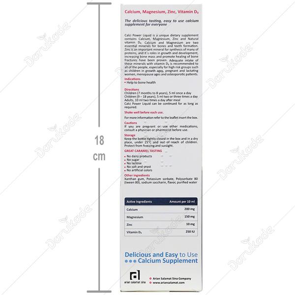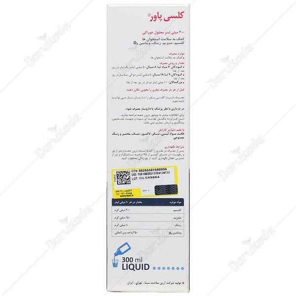 شربت کلسی پاور مکمل غذایی ویژه، محتوی املاح کلسیم، منیزیم، روی و همچنین ویتامین D3 طبیعی است. کلیسم و منیزیم دو ماده ضروری برای تشکیل و استحکام استخوان ها و دندانها هستند. روی (زینک) عنصر معدنی لازم برای ساخت بسیاری از پروتئین های بدن بوده و نقش آن در رشد و نمو، افزایش توده استخوانی و ترمیم سریع تر شکستگی ها ثابت شده است. دریافت روزانه این املاح معدنی در مقادیر توصیه شده توسط سازمان بهداشت جهانی، به عموم مردم و خصوصا به گروه های در معرض خطر مانند کودکان در سنین رشد، زنان باردار و شیرده، زنان در دوران یائسگی و مبتلایان به پوکی استخوان تاکید می شود.