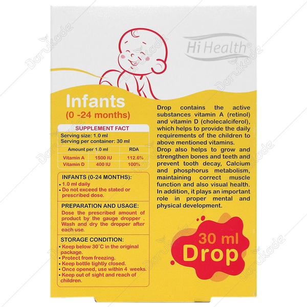 هر یک میلی لیتر قطره حاوی 1500 واحد ویتامین A و 400 واحد ویتامین D در روغن گیاهی (روغن آفتابگردان، دارای پروفایل ویژه ای از اسید چرب) و بدون هیچگونه مواد افزودنی دیگر می باشد. استفاده از روغن آفتاب گردان در فرمولاسیون باعث شده است که فرآیند جذب و فراهمی زیستی ویتامین های محلول در چربی را بهبود ببخشد.