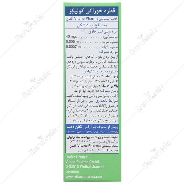 قطره کولیکز تحت لیسانس Vitane Pharma آلمان، در شرکت داروسازی امین تولید و شرکت دارو درمان سپهر نماینده انحصاری و دارنده پروانه ساخت این محصول در ایران می باشد.