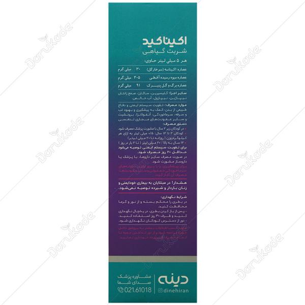 هر 5 میلی لیتر از شرت اکیناکید حاوی 405 میلی گرم عصاره میوه سامبوکوس نیگرا (آقطی) استاندارد شده بر مبنای 0.1 درصد آنتوسیانین، 91میلی گرم عصاره موسیلاژی پنیرک و 30 میلی گرم عصاره اکیناسه می باشد که بر مبنای 6 میلی گرم مشتقات کافئیک اسید در هر 5 میلی لیتر شربت استاندارد شده است.
