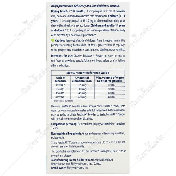 کودکان 12-7 ماهه: روزانه 1 پیمانه (معادل 15 میلی گرم آهن المنتال) و یا طبق دستور پزشک.