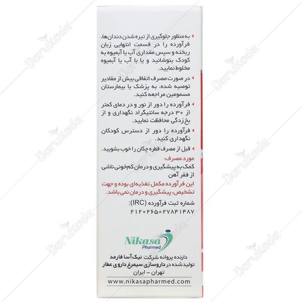 - به منظور جلوگیری از تیره شدن دندان ها، فرآورده را در قسمت انتهایی زبان ریخته و سپس مقداری آب یا آبمیوه به کودک بنوشانید و یا با آب یا آبمیوه مخلوط نمایید.