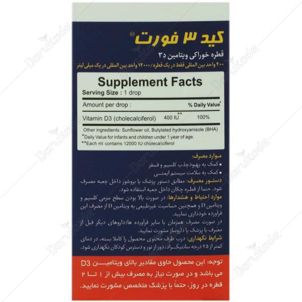 - به ازای هر قطره حاوی 400 واحد بین المللی ویتامین د3