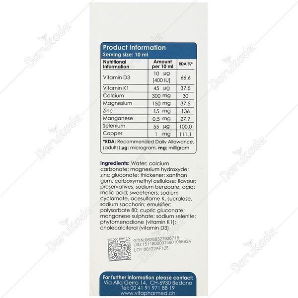 حاوی کلسیم، ویتامین D3، ویتامین K1، منیزیم، روی، منگنز، سلنیم و مس